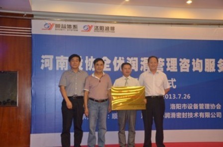 根據河南省設備管理協會豫設【2013】12號文件,為了進一步推進河南省設備管理事業的發展,發揮高新技術企業引領作用,做好政企服務和對接的紐帶與橋梁,依托洛陽潤邦潤滑密封技術有限公司成立河南省設備管理協會全優潤滑管理咨詢服務中心,授牌儀式于2013年7月26日在洛陽新友誼大酒店隆重舉行,河南省設備管理協會會長張根山、秘書長程平、副秘書長藏義明、辦公室主任耿浩、洛陽市設備管理協會會長李書良、秘書長陳生龍、辦公室主任張珺然、順益體系總裁張建新、西班牙老鷹中國代表處西北大區經理孫峰、洛陽潤邦常務總經理兼全優潤滑管理咨詢服務中心主任譚江平、洛陽潤邦市場部經理兼中心副主任張正華、河南省數十家企業、一百五十余名設備中高層管理人員出席儀式。