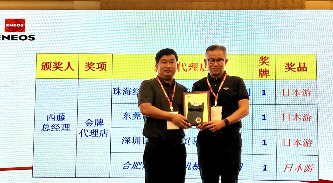 緊接著,會議進入了表彰環節。西藤總經理親自為優秀經銷商頒發了獎牌和證書,并與他們合影留念。順益榮獲金牌代理店稱號,成為引能仕在中國市場最優秀的合作伙伴之一。順益(體系)集團副總裁聶湘上臺領獎。